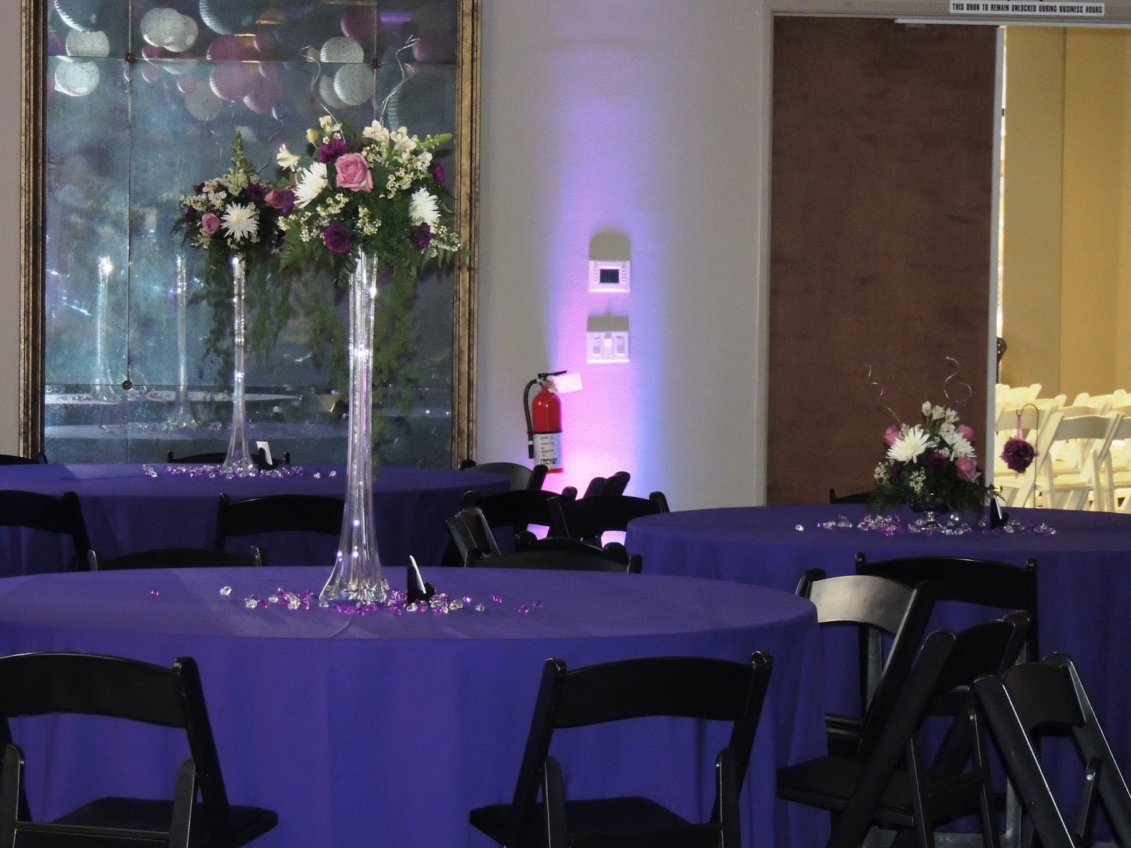 guest table centerpieces, mirror base, assorted purple flowers, scatter gems, colored water, silver birch branches